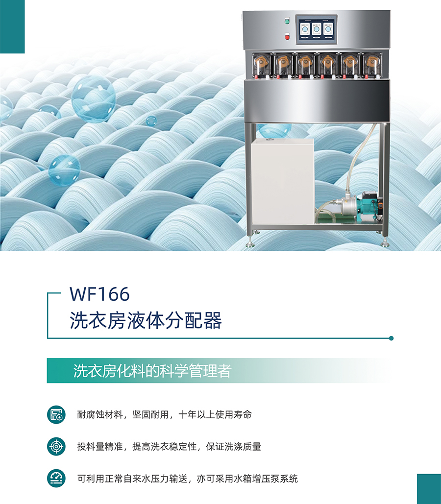 洗衣房液體分配器是洗衣房化料的科學(xué)管理者,致力于解放人力,提高洗衣質(zhì)量。配合液體分配器自動(dòng)投放液體化料,通過編程,可實(shí)現(xiàn)與洗衣機(jī)同步,在不同的洗衣程序時(shí)自動(dòng)投入相應(yīng)的洗衣化料至洗衣機(jī)中,實(shí)現(xiàn)真正意義的洗衣過程全自動(dòng)。隨著越來越多的洗衣廠、洗衣房選擇液體洗衣化料及政府對無磷化的控制,更多的用戶會(huì)選擇液體洗衣化料。這是一種更方便、更環(huán)保的選擇。